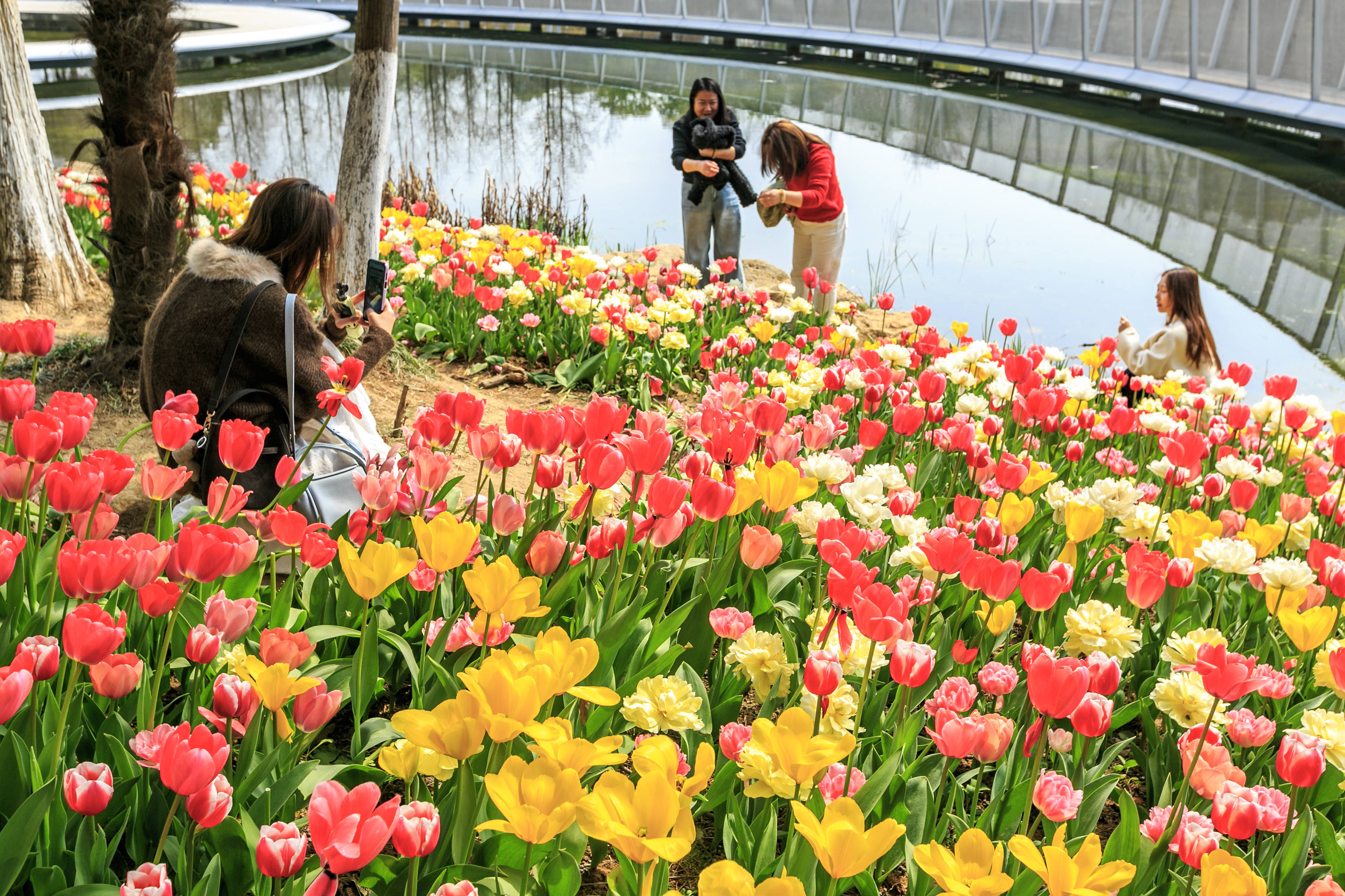 ↑2026年3月11日,搭客在安徽省芜湖市神猴子园不雅赏郁金香。CICPHOTO/陶海金 摄