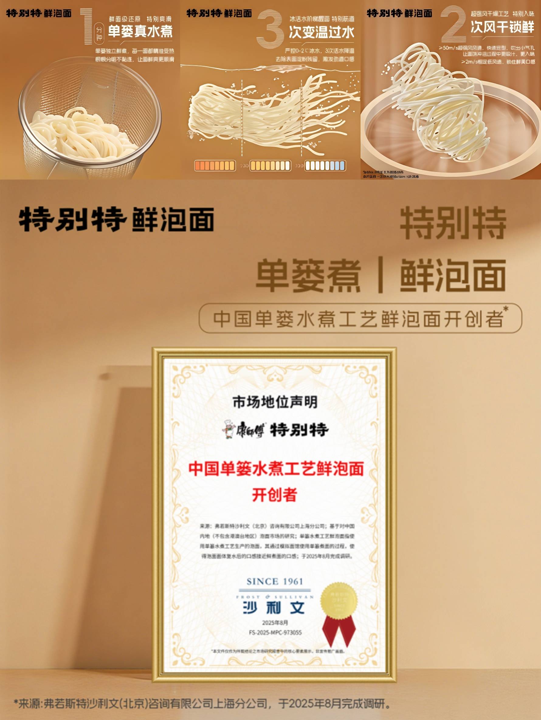 凭借此项改进,康师父还在2025年8月得回由沙利文认证的“中国单篓水煮工艺鲜泡面创始者”名称。