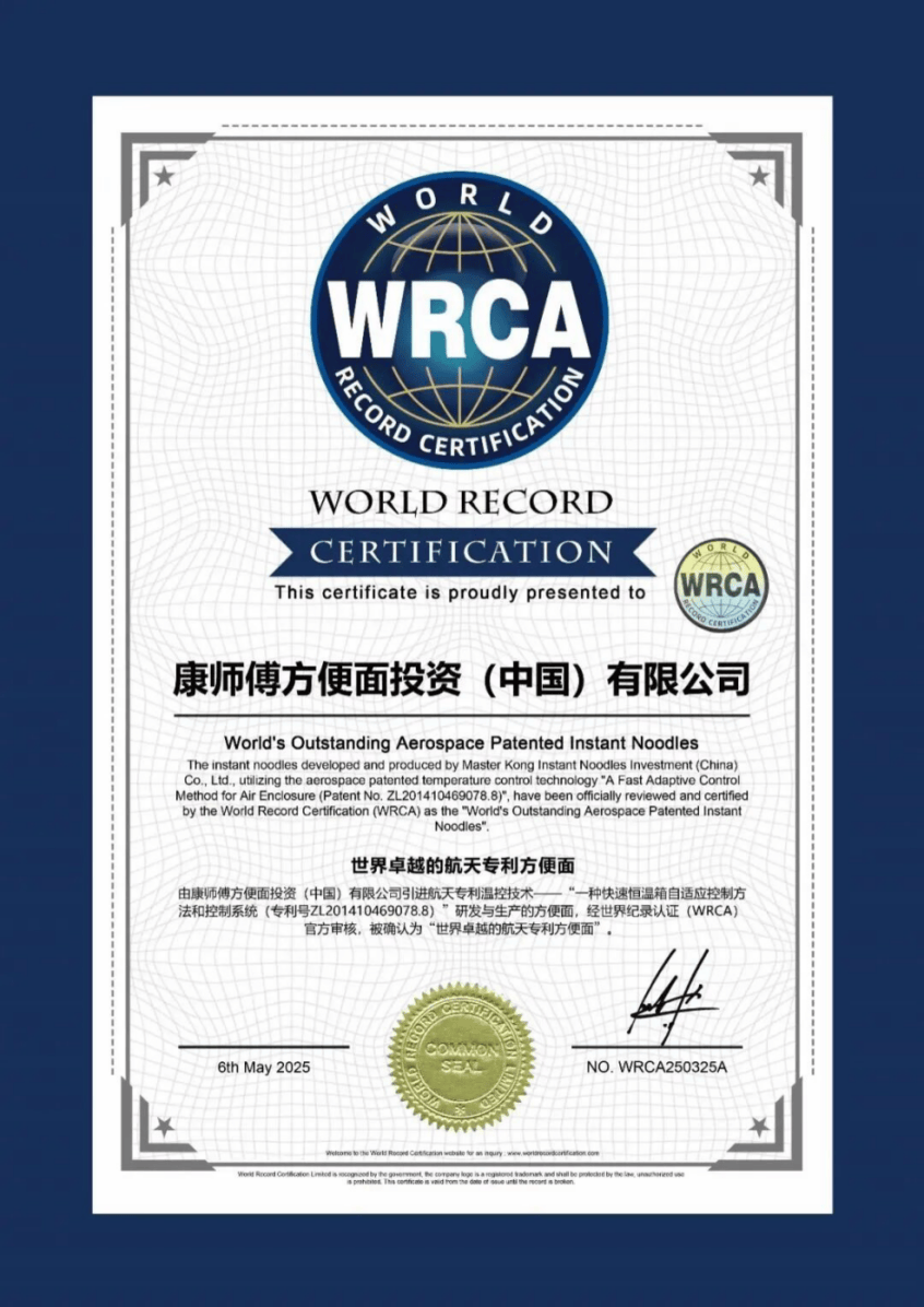 康师父是世界首个将航天专利工夫利用于方便面出产的企业,他们将航天温控工夫融入出产法度,使居品在南北跨越50℃的极点温差下仍能保持风范安定。凭借硬核实力,2024年,康师父斩获WRCA“世界超卓的航天专利方便面”认证。