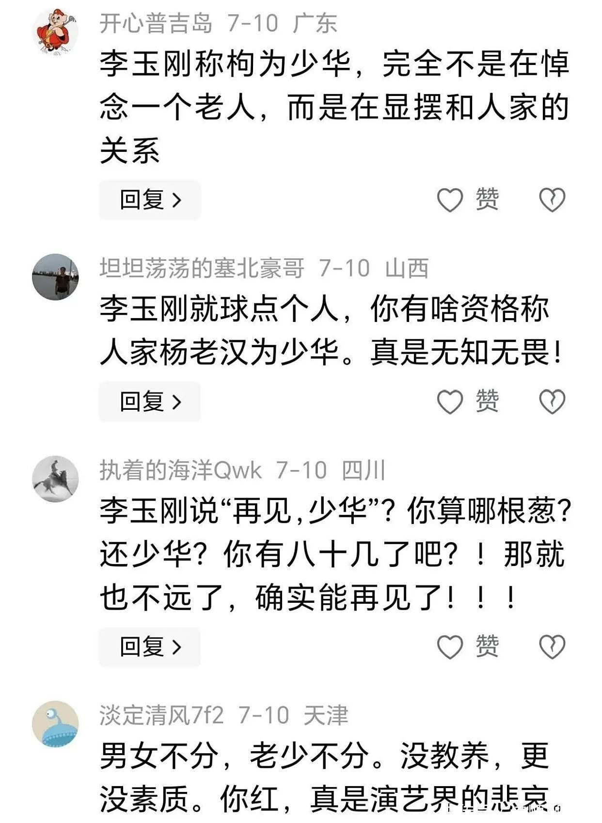 反复琢磨李玉刚的悼文,确乎能看出他对文化礼节意会不够。比如他说杨少华是他“心中的长辈”,这自己没问题,可跟称号矛盾,一个是“少华”,一个又是“长辈”,说得不匀称。更别提临了用“最深爱的东说念主”来边幅一位前辈,这种抒发听起来就怪怪的,大致亲密偏执了,吹得有点离谱。