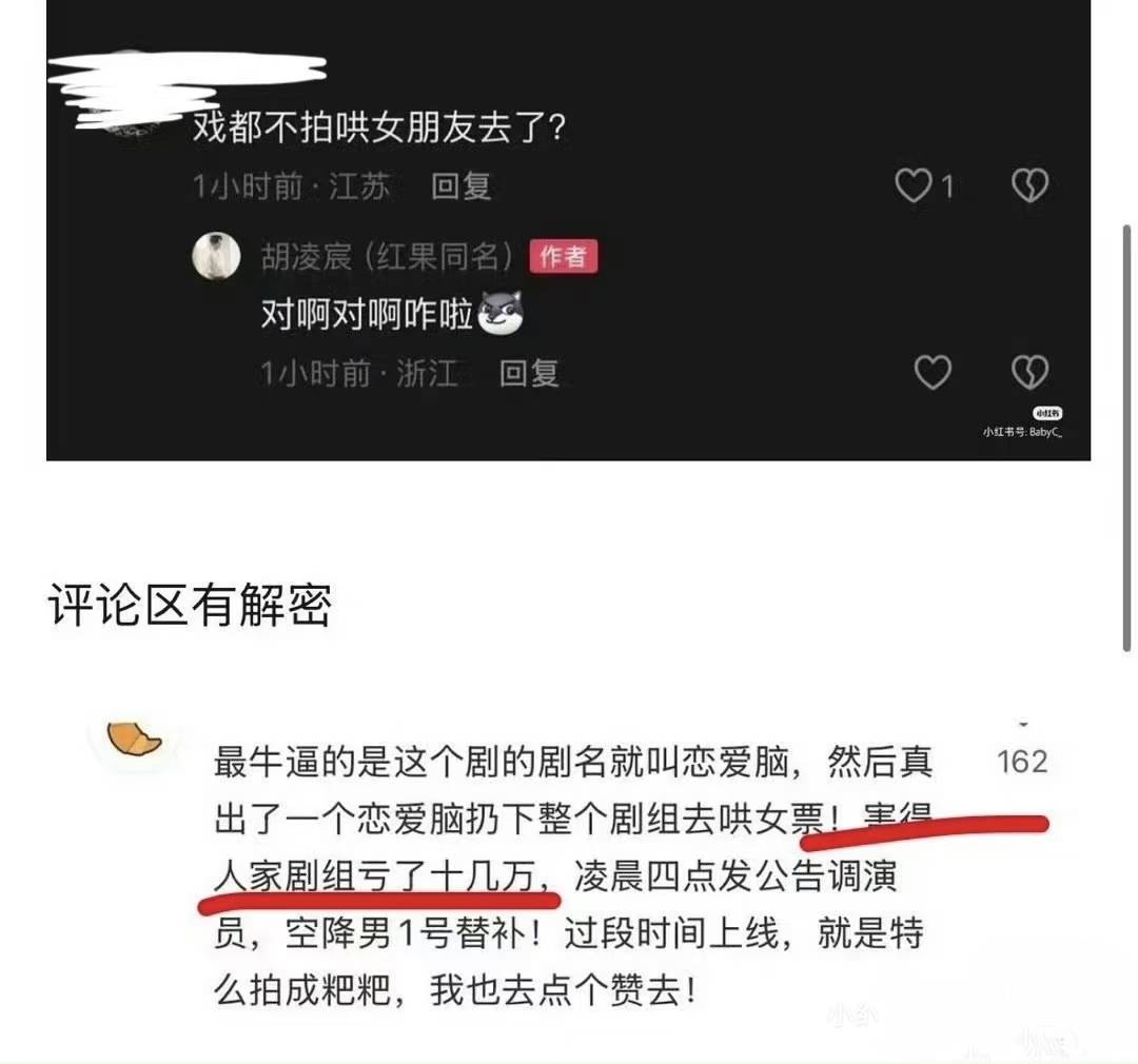 其实,短剧圈最近“塌房”事件频出。前有演员何健麒被曝出轨“榜一大姐”,哭着求宥恕;后有胡凌宸为哄女友抛下剧组,号称“恋爱脑天花板”。